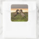 Pegatina de dos caballos salvajes de Konik a la puesta de sol en el Parque Nacional Oostvaardersplassen en los Países Bajos.