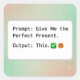 Haz que tus regalos vacacionales sean inolvidables con este ingenioso diseño inspirado en la IA! Presentando la frase "Preguntar: Dame el presente perfecto. Salida: Esto" en formato de código, esta etiqueta de regalo o pegatina es parte del juego exclusivo ChatGPT Wrapped My Gifts Navidades 2025. Perfecto para los amantes de la tecnología, los programadores, los aficionados a la IA y todo aquel que aprecie el humor inteligente, estas etiquetas le dan un giro moderno al tradicional envoltorio vacacional. Añade personalidad, risas y un ambiente futurista a tus regalos navideños esta temporada!