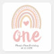 Pegatina lindo del primer cumpleaños con un arcoiris boho en colores pastel mudos y un corazón rosa en el medio. Debajo está "uno" en el guión junto con su nombre, título del evento y fecha. Estos pegatinas personalizados son una buena manera de agregar un toque personal a los favores de la fiesta para la fiesta de primer cumpleaños de su hija.