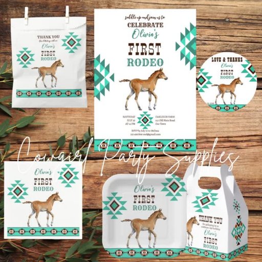 Primer rodeo de patrones folclóricos turquesa en el suroeste del país pequeño cowboy baby horse foal fiesta de cumpleaños estilo occidental personalizado gracias pegatinas. Para los niños y para los chicas, los colores del agua y el marrón pueden coincidir con muchos elementos decorativos y otras cosas.