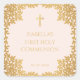 Este elegante diseño religioso en rosa y dorado con aire vintage, recomendado para la primera comunión de una niña, tiene un marco de lámina de oro falso ornamentado con ramas intrincadas con hojas sobre un fondo rosa pálido. Sobre el texto hay una cruz religiosa, también en lámina de oro falso. El texto es dorado.