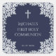 Este elegante diseño religioso de color azul marino y plata con un aire vintage, recomendado para la primera comunión de un niño, tiene un marco de lámina de plata falsa ornamentado con ramas intrincadas con hojas sobre un fondo azul marino. Sobre el texto hay una cruz religiosa, también en lámina de plata falsa. El texto tiene un color gris plateado similar al marco de plata falsa.