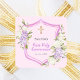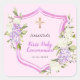 Un fondo rosa suave. Decorada con un escudo rosa, flores rosadas y violetas, flores. Con una cruz dorada. Personalice y agregue un nombre y una fecha.