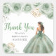Esta pegatina de quinceañera presenta una hermosa princesa con un vestido de gala verde salvia y arreglos florales. Es perfecta para una fiesta de cumpleaños de quinceañera.