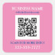 Personalice su código QR en cualquier color oscuro. Añade tu nombre de negocio, sitio web, mensaje y teléfono con texto en blanco y azul oscuro en rosa.