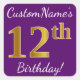 Pegatina Cuadrada Purple, Faux Gold 12th Birthday + Custom Name