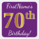 Pegatina Cuadrada Purple, Faux Gold 70th Birthday + Custom Name
