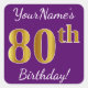 Este sencillo diseño pegatina de cumpleaños incluye un mensaje como "¡Cumpleaños 80 de tu nombre!", con el "80" con un aspecto de color falso/imitación de oro, en un fondo de color morado. El nombre se puede personalizar. Pegatinas como estos podrían ser tal vez un regalo para alguien que esté celebrando su ochenta cumpleaños, o tal vez podrían ser usados como decoraciones en una fiesta de cumpleaños. [~Z0000246]