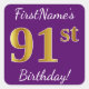 Pegatina Cuadrada Purple, Faux Gold 91st Birthday + Nombre personali