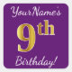 Este sencillo diseño de pegatina de cumpleaños incluye un mensaje como "¡Cumpleaños 9 de tu nombre!", mientras que el "Noveno" tiene un aspecto de color falso/imitación de inspiración dorada, en un fondo morado. El nombre se puede personalizar. Pegatinas como estos podrían ser tal vez un regalo para alguien que esté celebrando su noveno cumpleaños, o tal vez podrían ser usados como decoraciones en una fiesta de cumpleaños. [~Z0000246]