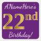 Este sencillo diseño pegatina de cumpleaños muestra un mensaje como "¡El cumpleaños número 22 de ANameHere!", y el "22" tiene un aspecto de color falso/imitación dorado, con un fondo morado. El nombre se puede personalizar. Pegatinas como estos podrían ser tal vez un regalo para alguien que esté celebrando su vigésimo segundo cumpleaños, o tal vez podrían ser usados como decoraciones en una fiesta de cumpleaños. [~Z0000246]