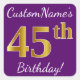 Pegatina Cuadrada Púrpura, Faux Gold 45th Birthday + Nombre personal