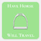 Este divertido diseño tiene un hierro de hierro fundido en inglés con las palabras "Have Horse Will Travel" para mostrar que tú y tu caballo (o pony) están listos para cualquier cosa.