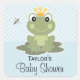 Añade tu nombre y evento a estos adorables partidos de príncipes de rana favorecen a las etiquetas y pegatinas con una adorable y arrogante kawaii usando una corona contra un cielo azul polka dot. Pintura © Chrissy H. Studios, LLC. Todos Los Derechos Reservados.
