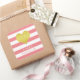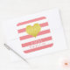 Feliz cumpleaños pegatina con un falso corazón de Relieve metalizado dorado en un patrón rayado rosa y blanco. Decoración casera a juego.