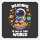 Reading is out of this world shows a cute astronaut sitting on a bright planet while reading a book in space. A playful space themed reading scene for book lovers, students and science fans who enjoy imagination and curiosity.
