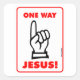 Este cartel callejero cristiano tiene una imagen de una mano que apunta al cielo con las palabras "Una Vía" y "Jesús" escritas con letras rojas audaces.