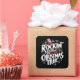 This sticker features a highly stylized, typographic design with a tiny Santa Claus figure playing a red drum kit at the top. The dominant feature is the white, distressed text which reads, "ROCKIN' AROUND THE CHRISTMAS TREE". Music notes surround the large font. The design is set against a solid black background. The design may look real due to the high detail and three-dimensional texture in the artwork.
