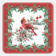 El fondo rojo y blanco con las fronteras de Poinsettia y un pájaro mockinero rojo en una rama con bayas de invierno, crea un diseño único, clásico y atemporal.
