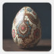 An ornately decorated Easter egg positioned on a dark wooden surface. The egg is predominantly cream-colored and adorned with intricate floral patterns in shades of blue, pink, and brown.