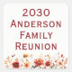 Celebrate your family gathering with a touch of seasonal elegance using this customizable family reunion sticker. The design features a beautiful watercolor border of meadow wildflowers in warm autumn tones—including deep burgundy, burnt orange, golden yellow, and sage green.