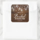Pegatina de la plaza Rustic Bridal Shower con luces en tarros de máscaras y cuerdas de luces con la palabra "ducha de novia" en un fondo de patrón de madera marrón. Es el pegatina perfecto para una ducha de novia rústica o rural. Consulta la invitación coincidente y elementos como pegatinas y sellos aquí https://www.zazzle.com/collections/rustic_wood_mason_jars_and_lights-119202204970019494?rf=238364477188679314 Personalízalo reemplazando el texto del marcador de posición para añadir tu información. Para obtener más opciones, haga clic en el botón "Personalizar". *Tenga en cuenta que la marca de agua Zazzle que aparece en la vista previa del zoom NO aparecerá en el producto impreso final. © Rosewood y Citrus
