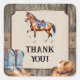 Ensillar y agradecer a sus invitados por venir a una fiesta de cumpleaños temática a caballo. El fondo de una tabla de madera indica el interior de un establo con un panel sostenido por correas de abrochamiento. El panel de color crema tiene un caballo a la cabeza para agradecer a los clientes por haber venido a divertirse con los caballos. Un par de botas de vaquero y un gorra se colocan hacia el fondo del pegatina con adornos de estilo occidental que acentúan el diseño. Disponible con productos a juego.