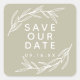 Las hojas de laurel enmarcan el texto "salva nuestra fecha" en pegatina de salvia.