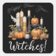 Este diseño celebra Samhain - Año Nuevo de las brujas. Incluye el texto "¡Feliz Año Nuevo brujas!", así como la imagen de algunas velas, hojas caídas, calabazas y una paloma. Todo el texto puede ser personalizado y la imagen puede ajustarse por tamaño y posición.