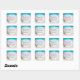 Gracias por tus pegatinas de negocios de pedido con una magnífica fotografía. Agua tropical azul y espumosidad en el fondo. Colección de conchas marinas y tallos en una playa de arena blanca.