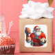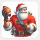 Santa Claus se mantiene confiado, vistiendo su clásico traje rojo y su gorra mientras sostiene una pelota de fútbol. Está rodeado de decoraciones festivas, que representan un espíritu lúdico de alegría de invierno y vacaciones. El ambiente alegre sugiere una temporada divertida y deportiva.