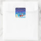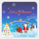 Hermoso paisaje de nieve con un árbol de Navidad, copos de nieve y un arcoiris sobre el cielo. Santa Claus está ondeando y dos renos están colgando juntos para distribuir regalos de Navidad.