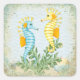 Dos caballitos de mar coloridos y tropicales amarillos con colas gemidas en algas. Purpurina imprime el borde con arena, mar y fondo de olas. Deliciosa temática de playa y de vida marina.