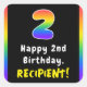 Este alegre y alegre diseño de pegatina cuadrado de cumpleaños presenta un gran número "2" con un patrón de gradiente inspirado en el espectro multicolor de arcoiris, junto con el mensaje "Feliz Segundo Cumpleaños", y un nombre de destinatario personalizado. Pegatinas con temas relacionados con el cumpleaños que atraen la vista como estos podrían ser distribuidos o usados en una fiesta de cumpleaños para alguien que está celebrando su segundo cumpleaños, o quizás usados al preparar regalos o invitaciones para tal evento. [~Z0000630]