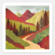 Un paisaje abstracto con texturas únicas que muestra un paisaje montañoso con senderos de senderismo y árboles y hermosos rayos de sol en tonos rojos, crimson, amarillos y verdes.