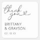 Pegatinas de boda minimalistas en blanco y negro con las palabras 'gracias' en un elegante guión que incorpora un corazón de amor, sus nombres y la fecha del boda.
