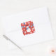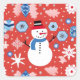 Un lindo muñeco de nieve con un gorra rojo y negro, y una bufanda azul claro sobre un fondo rojo con copos de nieve.
