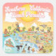 Una escena brillante y colorida ofrece una vista espectacular del sur de California: personajes extravagantes de la playa y el desierto de SoCal que exhiben los parques de Los Ángeles, Condado de Naranja, San Diego, Santa Barbara, Riverside, Palm Springs, El Centro, Salton Sea, Anza Borrego y Joshua Tree, entre otros. Esta encantadora escena lo tiene todo - un surfista cuelga diez mientras una ballena asesina salta del agua, animales del zoológico saludan a los turistas, y un tanque ruge a la distancia entre docenas de personas felices y criaturas que disfrutan del sol local...