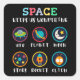 Playful space themed artwork made for curious kids and young students. Cute symbols like UFO, planet, moon, stars, rocket and alien help children explore space science and basic astronomy in a fun and friendly way.