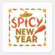Celebrate the New Year with this fun festive holiday sticker. Delight friends and co-workers with this whimsical design of flame emojis with red and green chili peppers that spell out "Spicy New Year", a sombrero on top and hot sauce pouring out over the year. Your friends will get a kick out of these stickers during the holidays.