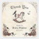 Spooky Halloween Baby Shower Thank You Square Pegatina presenta un mecedor de madera victoriano dibujado a mano con acentos rosas, cuerdas negras, telarañas, murciélagos, estrellas y esquinas florales de rosa sobre un viejo fondo de textura de papel vintage. Perfecto para sellar bolsos, cajas o sobres para bebés en celebraciones góticas, espeluznantes o de temática victoriana. Todo el texto es editable.