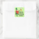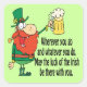 Este pegatina del Día de San Patricio muestra un leprechaun sosteniendo una taza de cerveza y el dicho "Donde quiera que vayas, y lo que hagas, que la suerte de los irlandeses esté contigo".