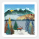 Un hermoso paisaje con colores y texturas únicos que muestran un paisaje montañoso y lacustre y un bosque multicolor con un sol naciente y un alce en tonos azules, verdes, dorados y magenta.