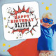 Pegatina Cuadrada Superhéroe discurso cómico Bubble Boy Feliz cumple