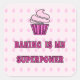 Diversión para cocineros y sobre todo para cualquiera que disfrute cocinando. La leyenda es de color rosa "Hacer pan es mi superpotencia" sobre un fondo de pequeños quequitos rosados, y la imagen principal es de un quequito rosado con remolinos de hielo rosado.