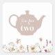 Una tetera rosa con una tipografía de "té para dos" en el interior, junto con una delicada acuarela pintada de flores silvestres en el fondo. ¡Perfecto para tu fiesta de té de cumpleaños!