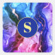 Un diseño de tinta líquida azul, púrpura y violeta rojizo de moda con monograma amarillo personalizado en círculo azul oscuro y dorado.