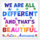 Cita inspiradora de "Todos somos DIFERENTES y eso es BELLO" con singulares rompecabezas de autismo, y coloridas mariposas volando en el fondo para apoyar y defender la conciencia del autismo.