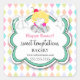 © 2021 Socialite Designs Inc. y LICENSORS. Estos elegantes quequitos vacacionales y sellos/pegatinas de bolsitas de conejo hacen un diseño maravilloso para usar como focas en el embalaje de panadería. El diseño es divertido y colorido, con huevos de Pascua, conejillos y un fondo diamantífero.