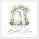 Una etiqueta elegante de Torta Nupcial presenta la caligrafía ''Torta Nupcial'' en letra manuscrita de moda, arco de entrada con flores al acuarela, follaje verde y novia con vestido de novia. Personalice con un nombre.